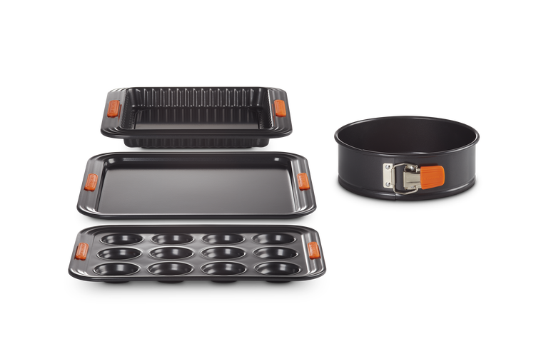 Tiered extravaganzas. Simple sandwiches. Cute cookies. Unleash your love of cakes and baking with this essential set. You'll discover our 20cm springform round tin, 23 cup bun tin tray, 23cm square tart tin, and rectangular baking sheet ¨C everything you need to explore, create and indulge!